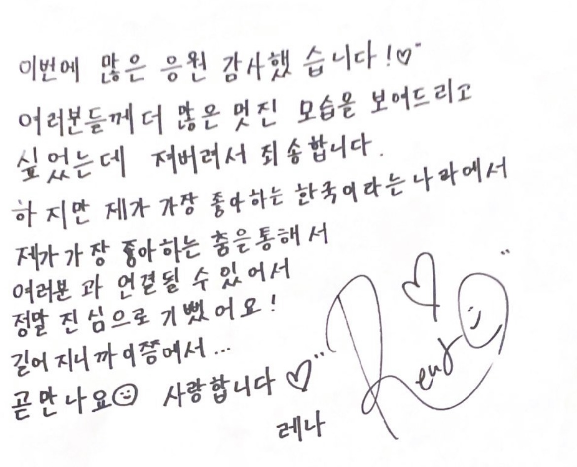 레나는 탈락 후 본인의 인스타그램에 한글로 자필 편지를 올렸습니다. ‘제가 가장 좋아하는 한국이라는 나라 에서 제가 가장 좋아하는 줌을 통해서 여러분과 연결 될 수 있어서 정말 진심으로 기뻤어요!’라고 말하며 많은 화제가 되고 있습니다.