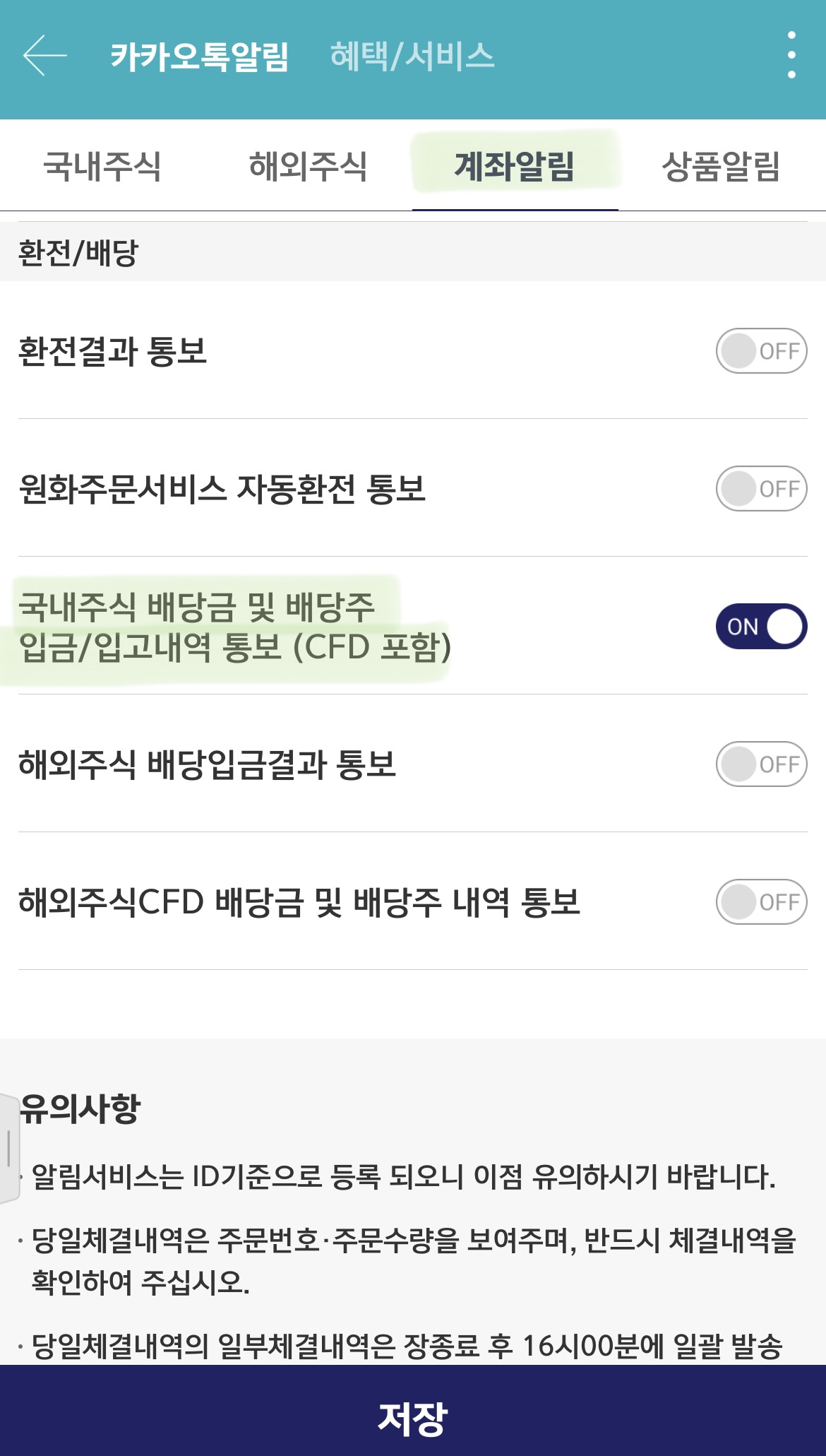 2. 계좌알림 > 카카오톡 알림 > 계좌알림 > 국내주식 배당금 및 배당주 입금/입고내역 통보 on 으로 변경 후 저장 클릭