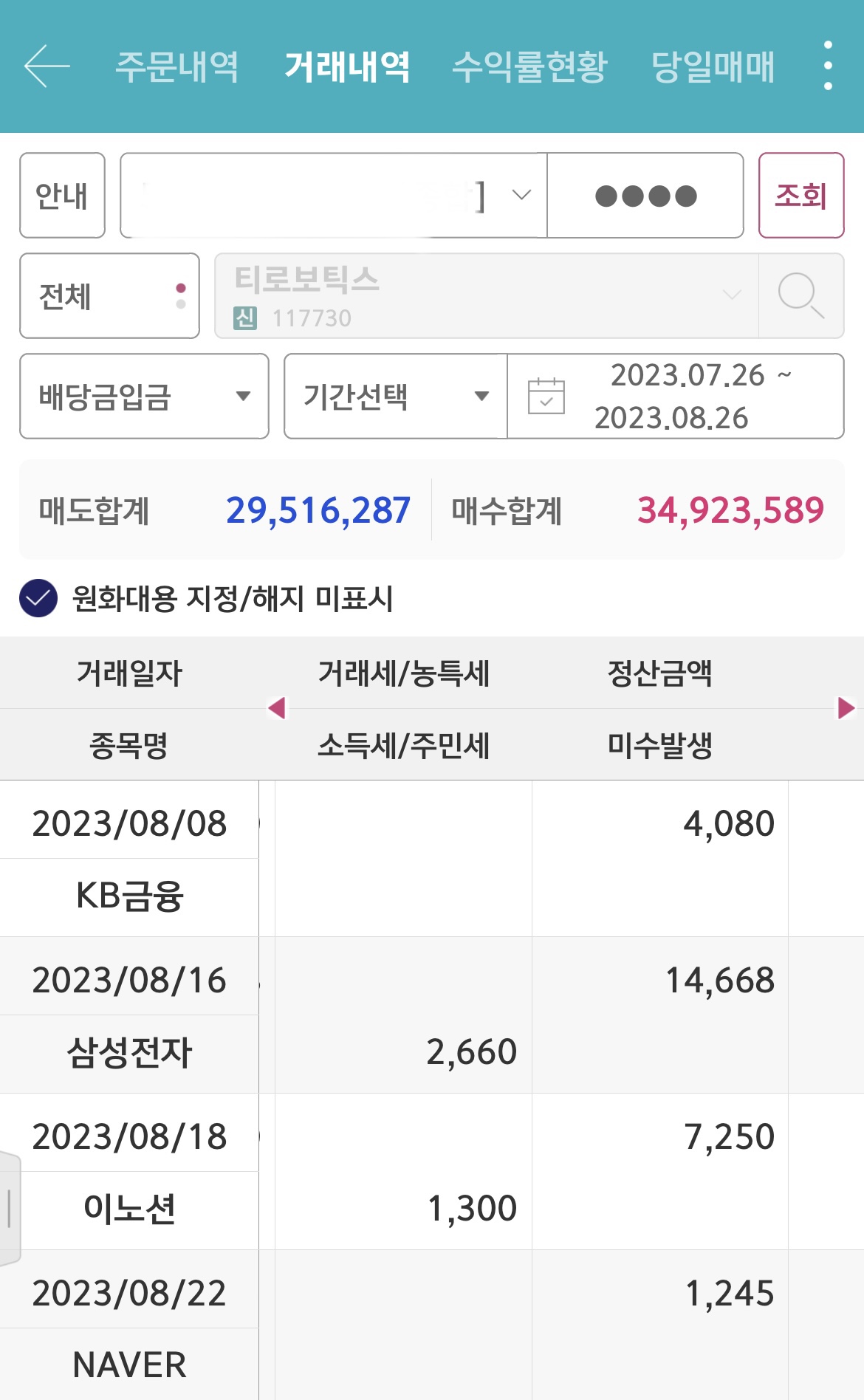 배당을 클릭하고 비밀번호를 입력 후 조회를 누르면 위의 화면처럼 배당입금내역이 조회가 됩니다. 세전과 세후 금액이 한 눈에 보이고, 가장 간단한 방법이에요.